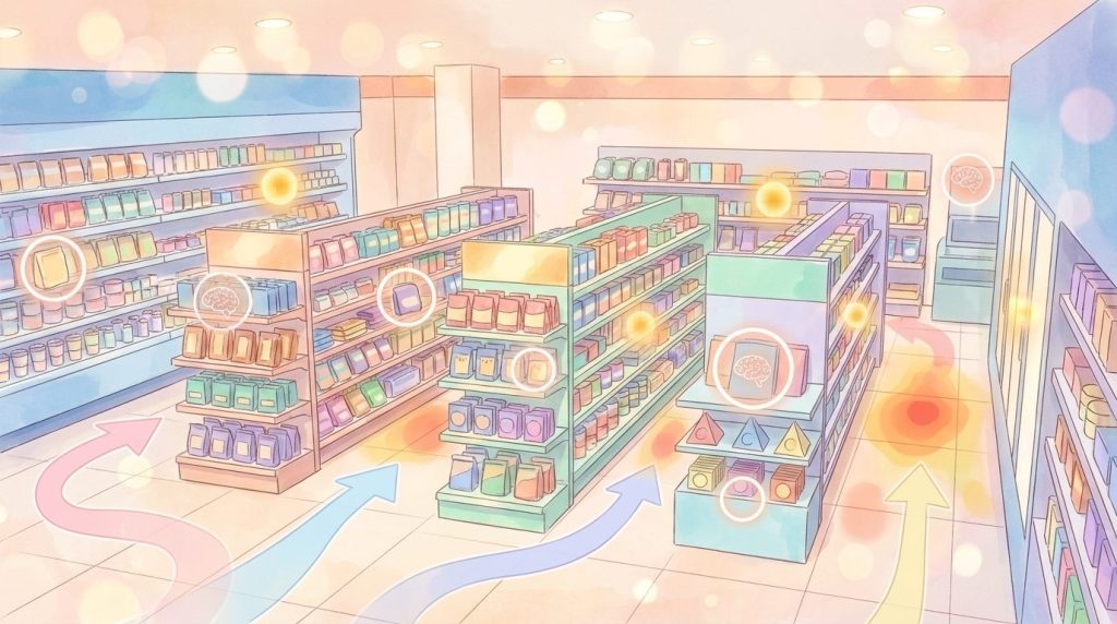 人間の買い物行動には、無意識のうちに働く心理メカニズムがあります。コンビニの商品配置は、この心理メカニズムを巧みに利用して、消費者の購買意欲を刺激するように設計されているのです。