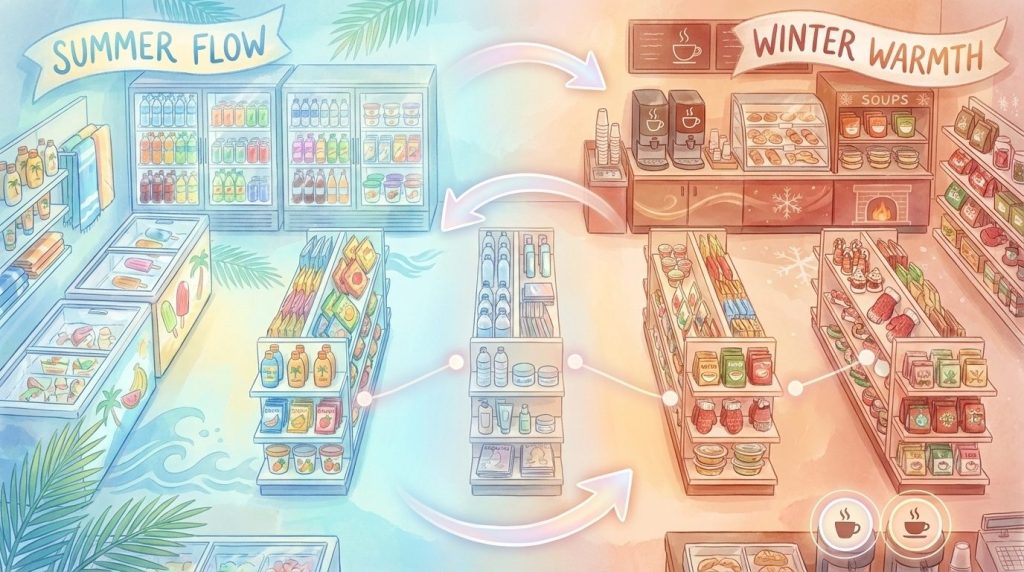 コンビニの商品配置は、季節の変化に応じて大きく変動します。これは単に季節商品を増やすだけでなく、店全体の配置レイアウトを戦略的に変更するものです。