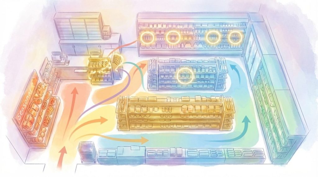 商品配置の工夫により、関連商品の同時購入を促進する「クロスセリング」の機会が生み出されます。例えば、おにぎりの近くに飲料を配置することで、おにぎりを購入する客が自然と飲料も購入する可能性が高まるのです。