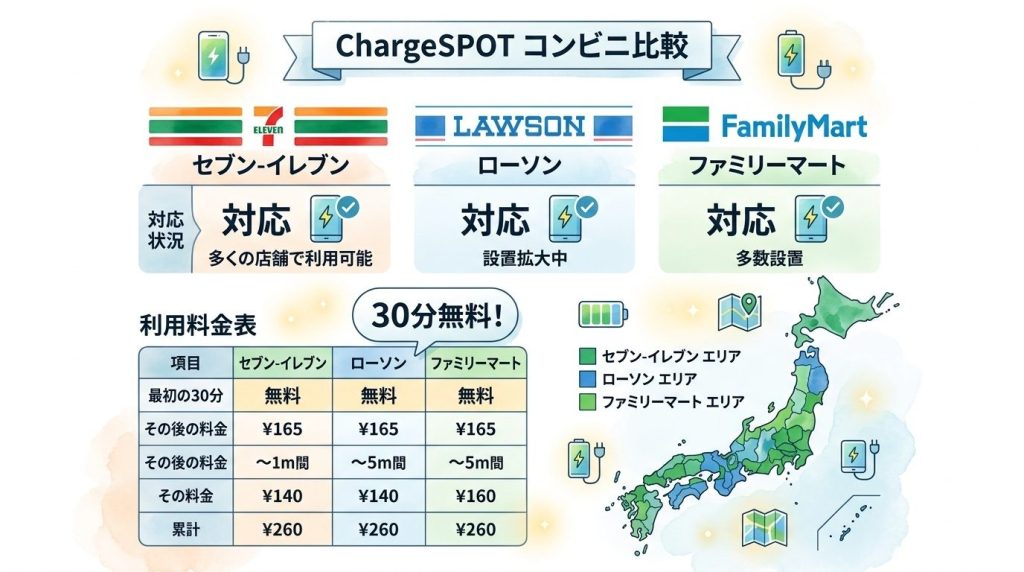 セブン‑イレブンでは30分無料キャンペーン、ファミリーマートでも同様のキャンペーンが実施され、利用者は低コストで充電できる環境が整いました。