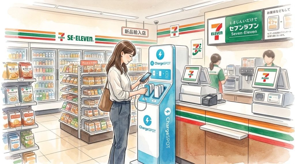 2024年から2026年にかけて、特にモバイルバッテリーシェアリング「ChargeSPOT」の急速な普及により、コンビニでの充電が極めて身近なものになりました。