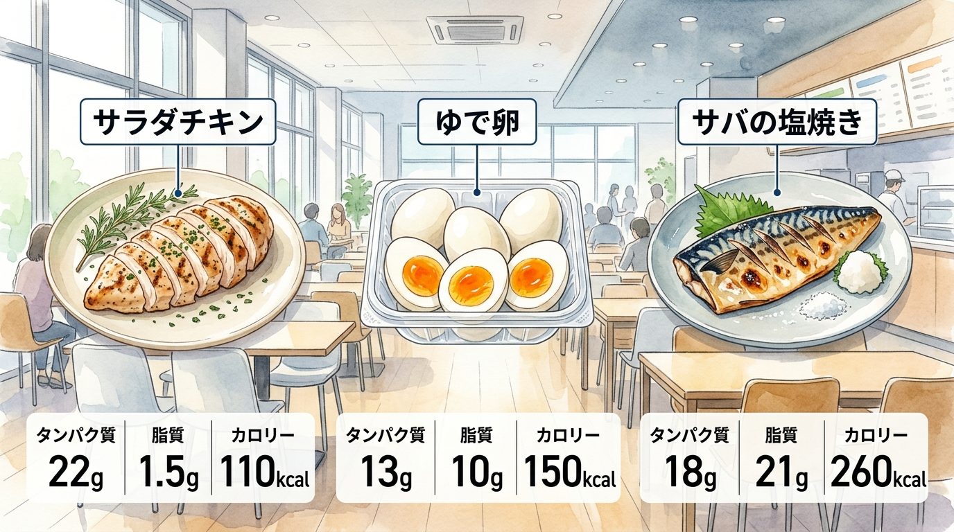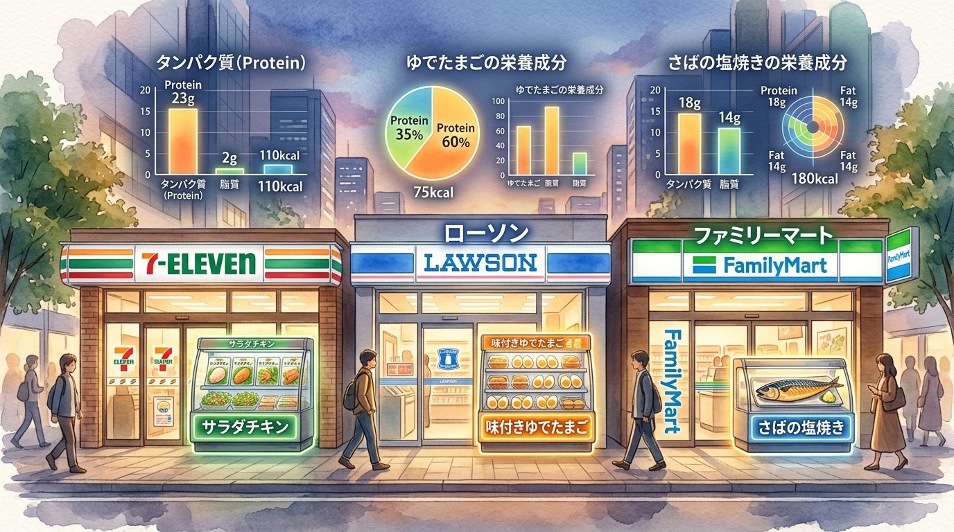3社の栄養成分に大きな差はなく、好みで選んで問題ありません。ゆで卵2~3個とサラダチキン1個の組み合わせで、タンパク質40g以上が簡単に確保できます。