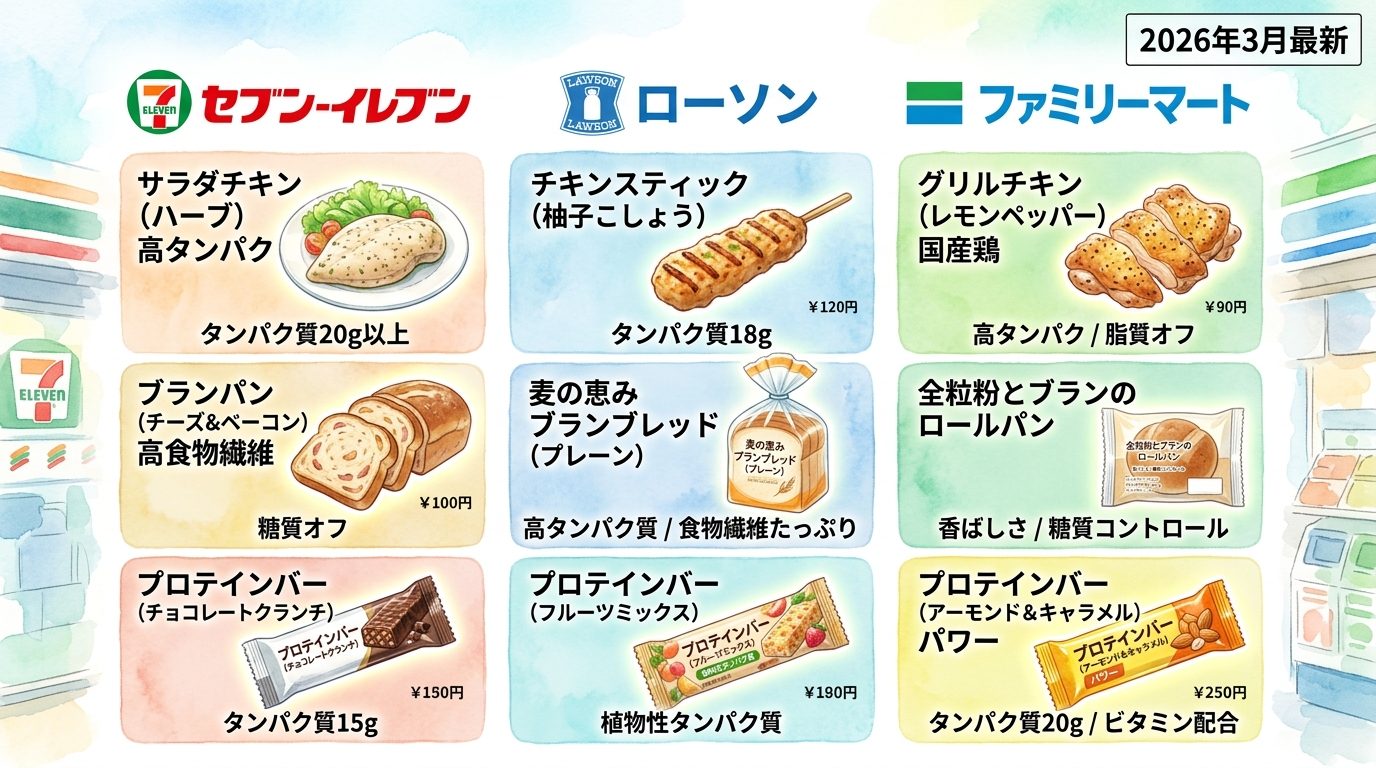 2026年3月時点で、各コンビニが発売した最新の高タンパク食品は、味のバリエーションがさらに豊かになっています。