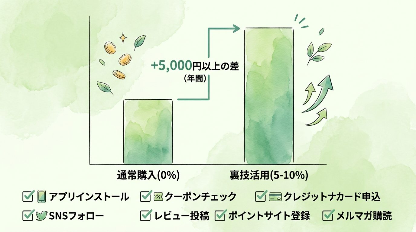 重要:複数のポイントプログラムを組み合わせることで、年間1,800~3,600円の節約が実現します。
